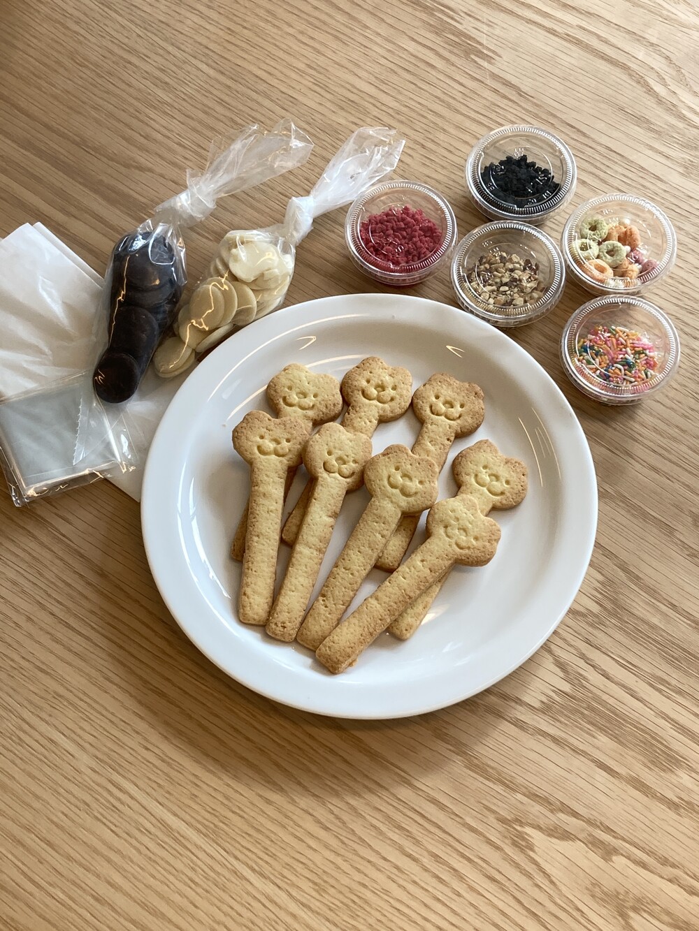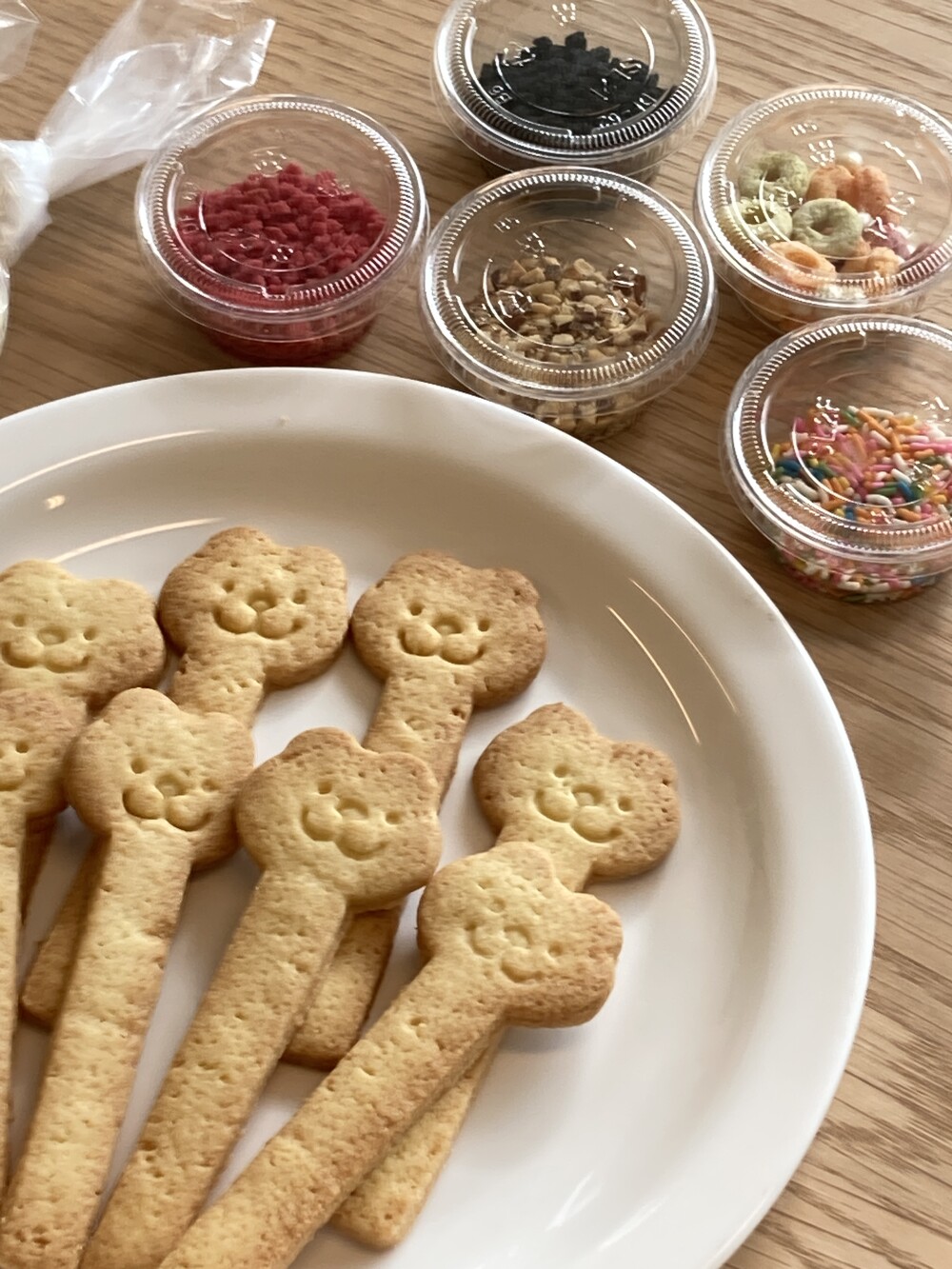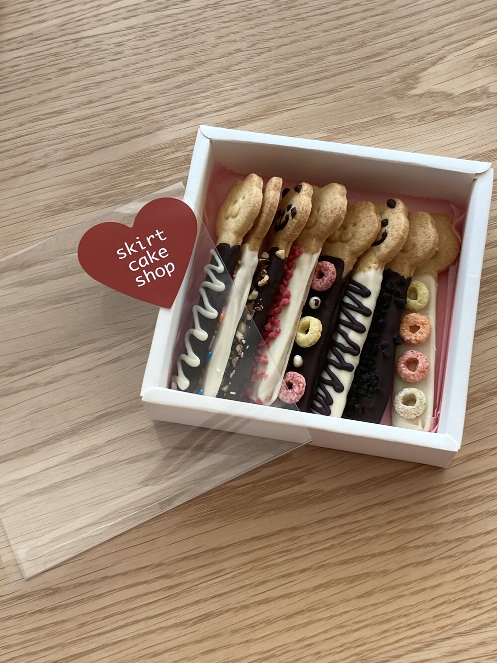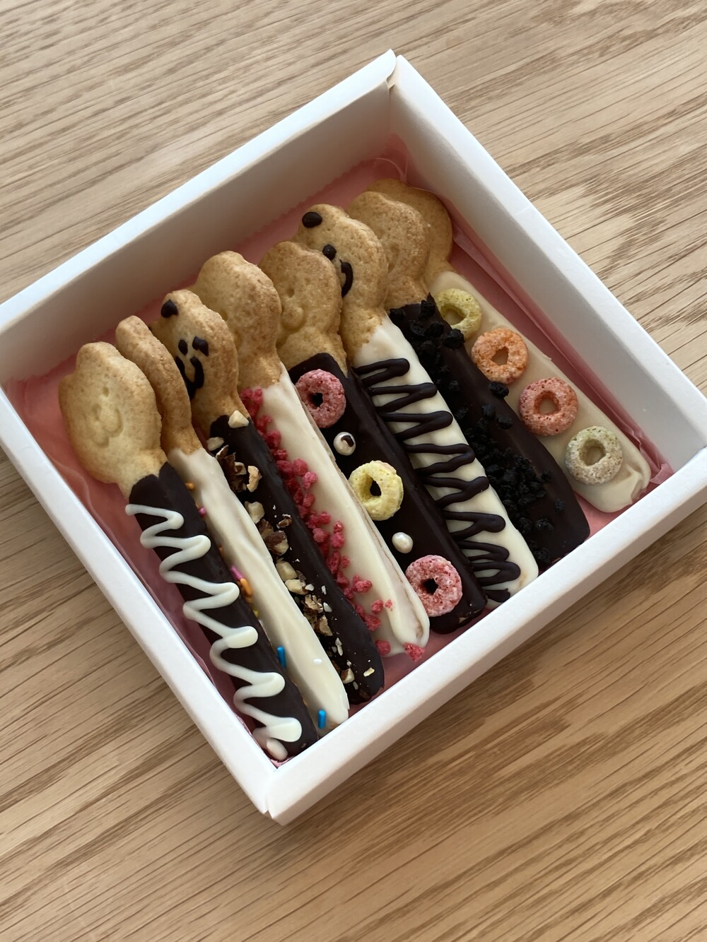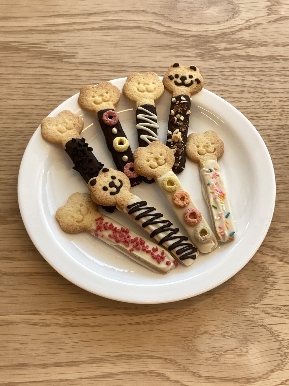 스틱에 초콜릿을 바른후 데코용 쿠키를 뿌려주시거나 올려주시면 되세요